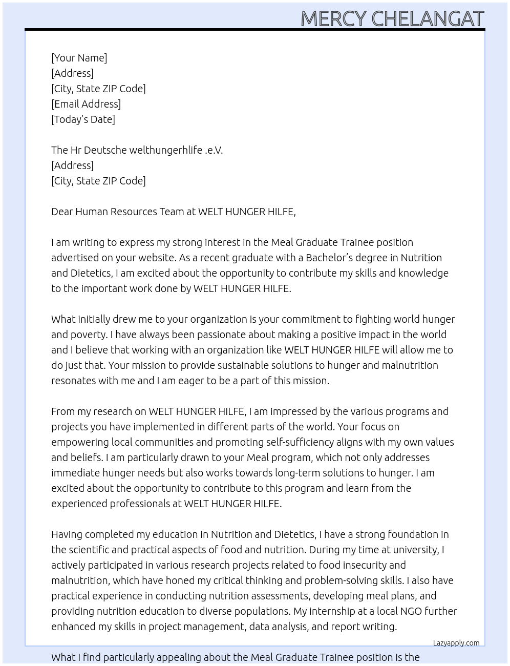 Meal graduate trainne Cover Letter At WELT HUNGER HILFE