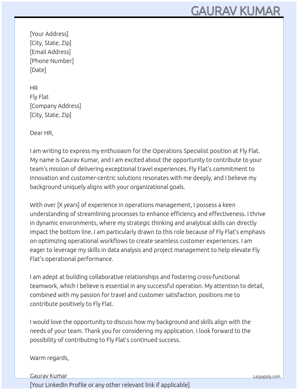 Check out these operation specialist cover letter sample and examples previously used by job seekers to land on job interviews as operation specialist. Use our AI cover letter generator to create a personalized cover letter as operation specialist.