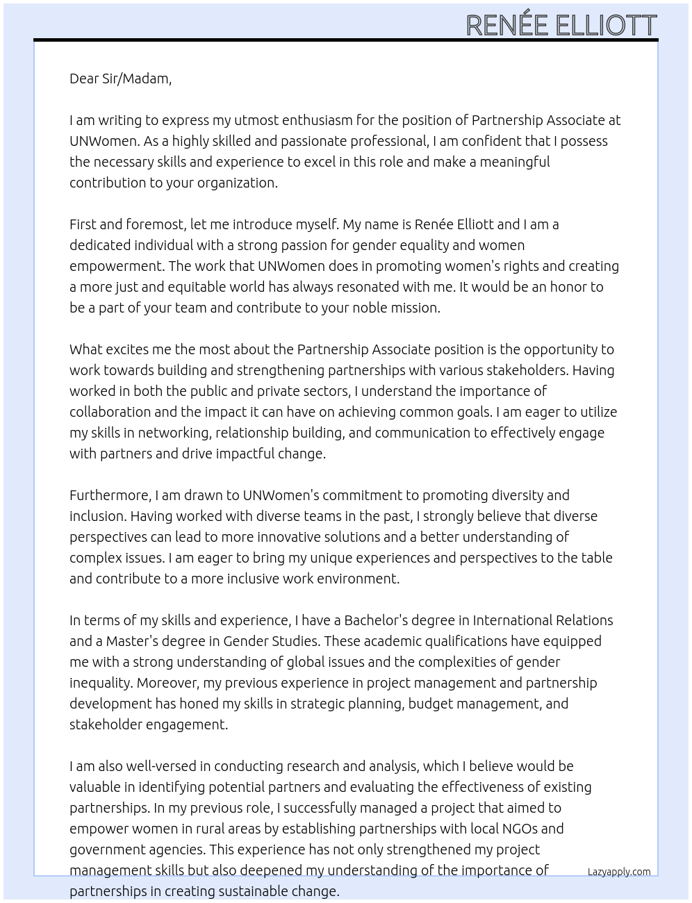Check out these partnership associate cover letter sample and examples previously used by job seekers to land on job interviews as partnership associate. Use our AI cover letter generator to create a personalized cover letter as partnership associate.