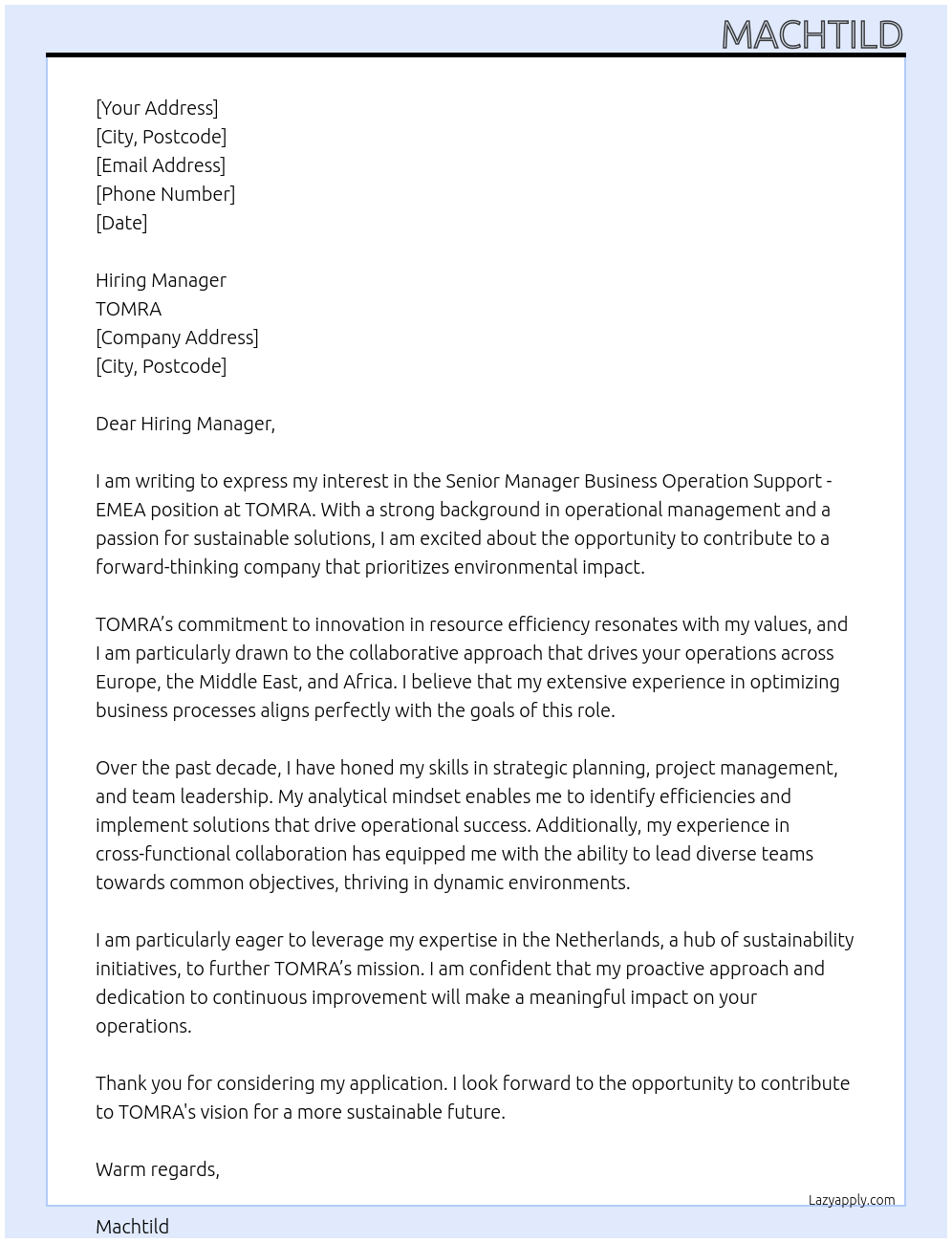 Senior Manager Business Operation Support - EMEA Cover Letter At TOMRA