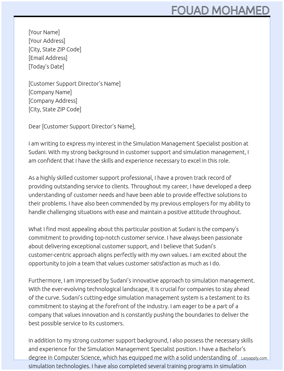 Check out these simulation management specialist cover letter sample and examples previously used by job seekers to land on job interviews as simulation management specialist. Use our AI cover letter generator to create a personalized cover letter as simulation management specialist.