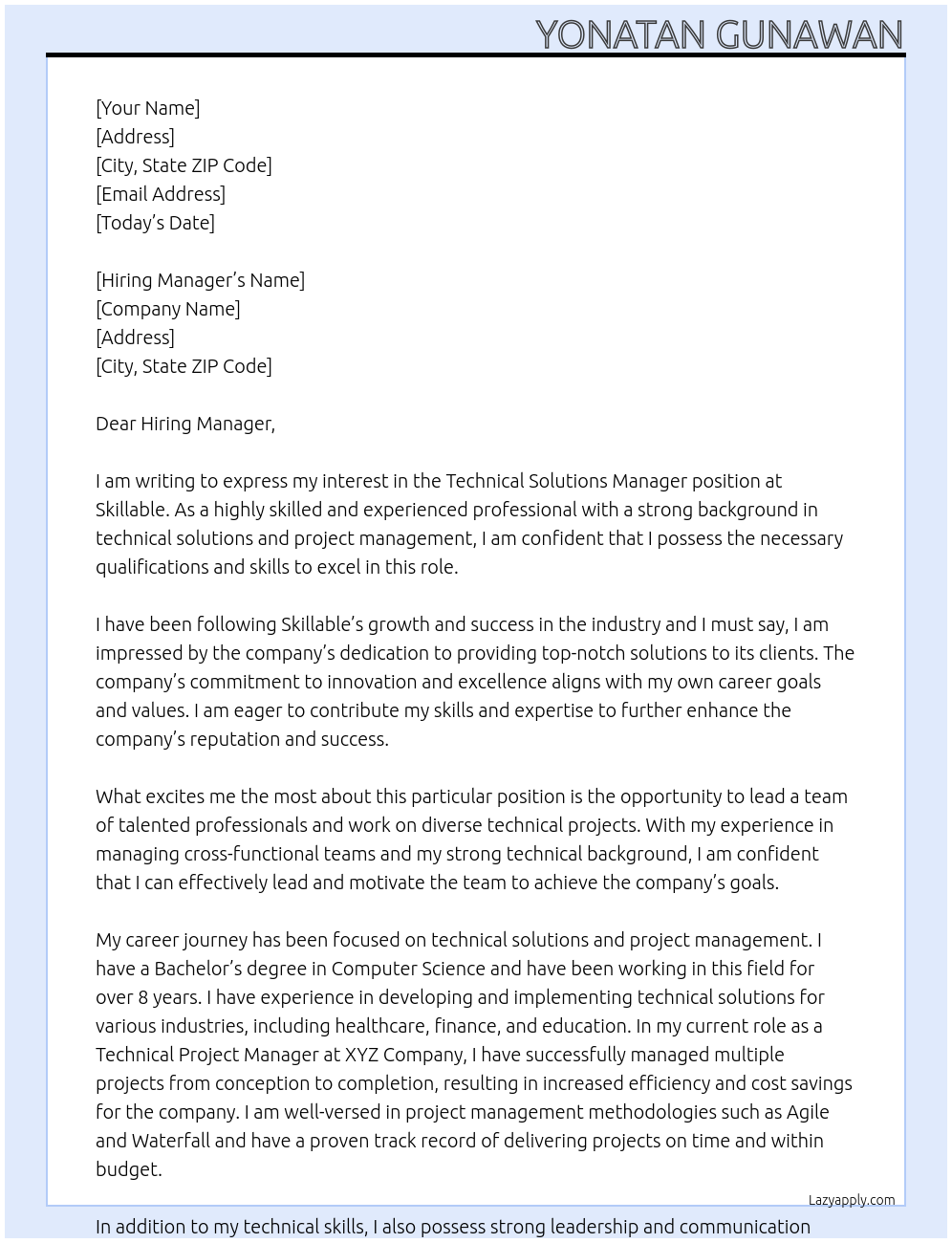 Check out these technical solutions manager cover letter sample and examples previously used by job seekers to land on job interviews as technical solutions manager. Use our AI cover letter generator to create a personalized cover letter as technical solutions manager.