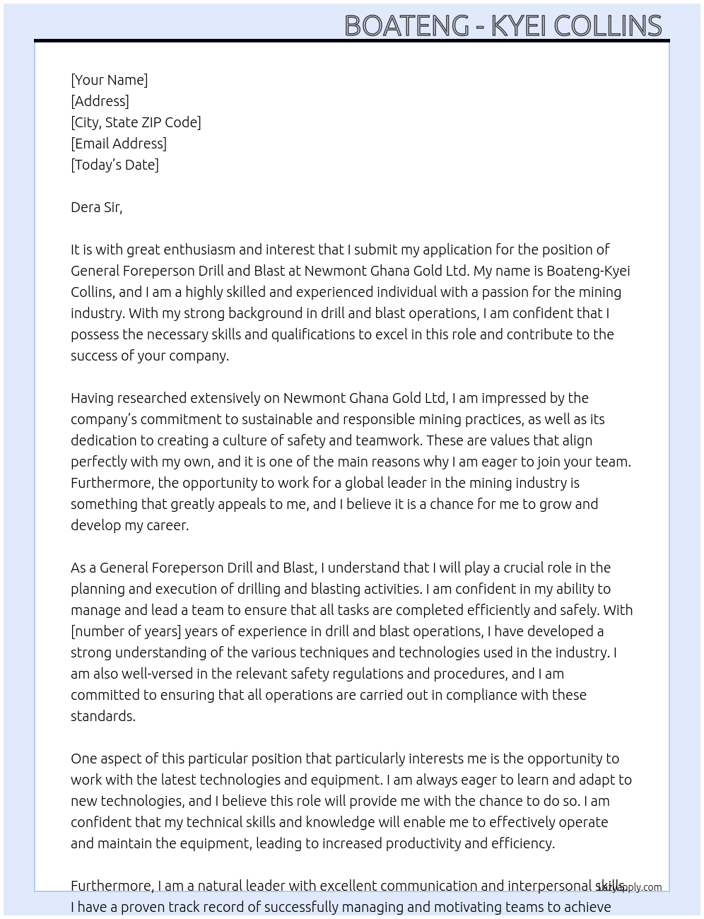 General Foreperson Drill and Blast Cover Letter At NEWMONT GHANA GOLD LTD