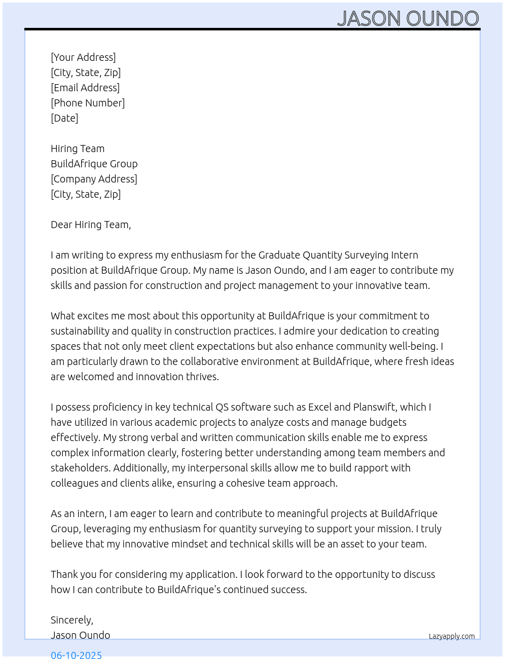 Graduate Quantity Surveying Intern Cover Letter At BuildAfrique Group