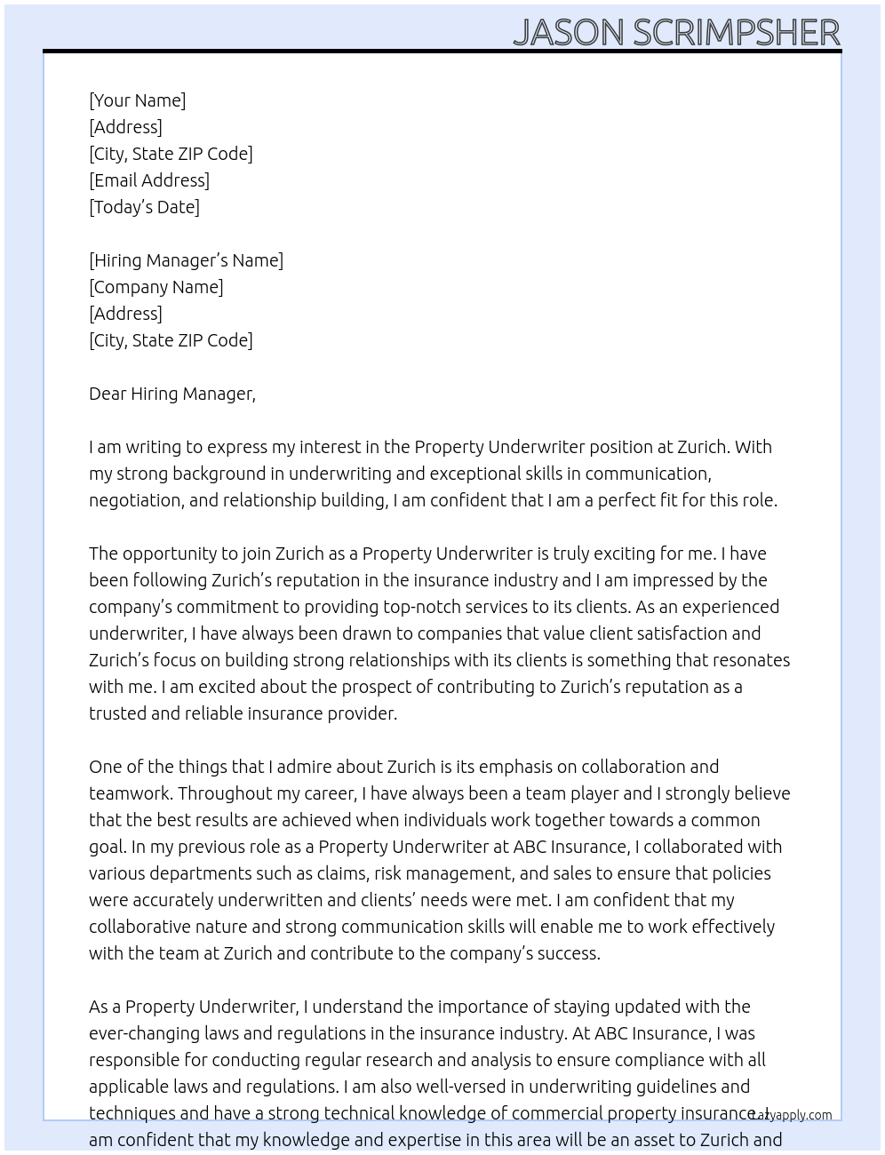 Check out these property underwriter cover letter sample and examples previously used by job seekers to land on job interviews as property underwriter. Use our AI cover letter generator to create a personalized cover letter as property underwriter.