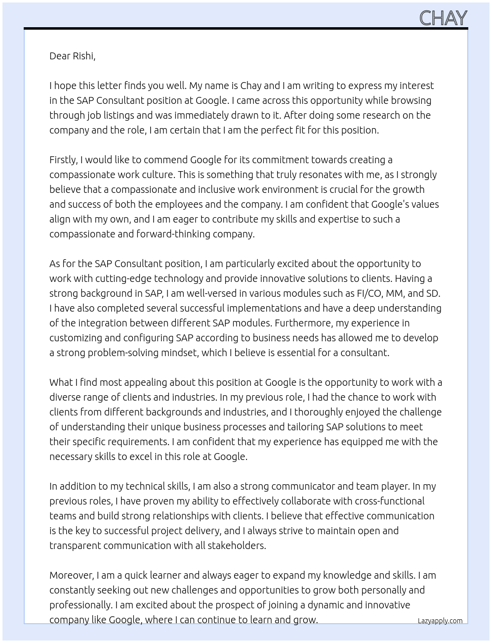 Check out these sap consultent cover letter sample and examples previously used by job seekers to land on job interviews as sap consultent. Use our AI cover letter generator to create a personalized cover letter as sap consultent.