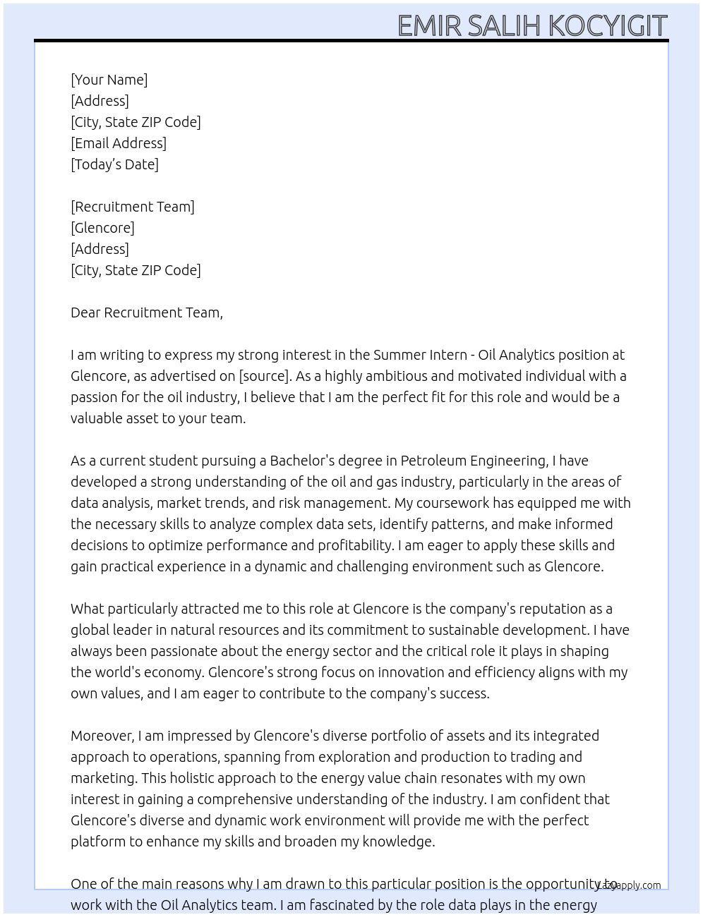 Summer Intern - Oil Analytics Cover Letter At Glencore