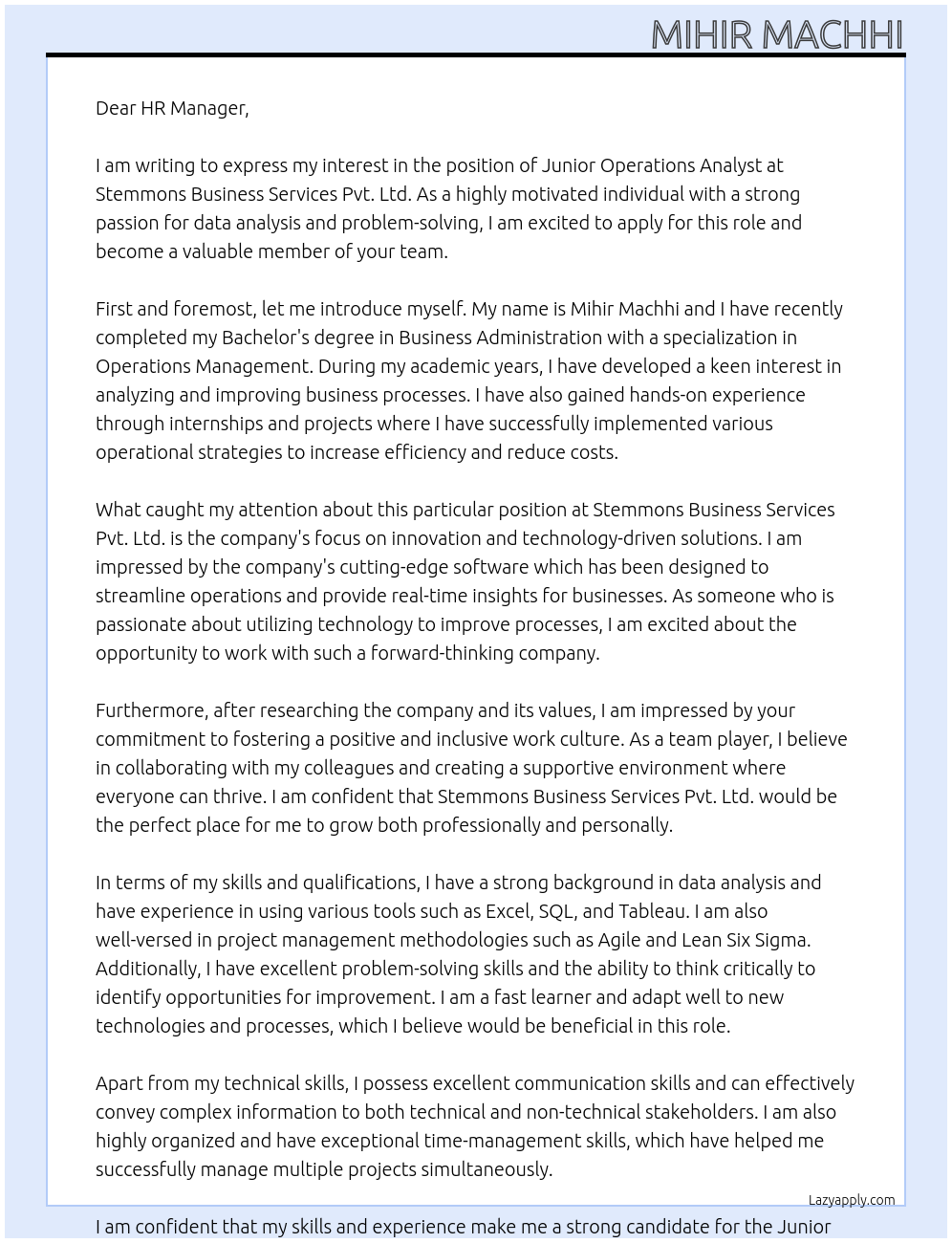 Junior Operations Analyst Cover Letter At Stemmons Business Services Pvt. Ltd.