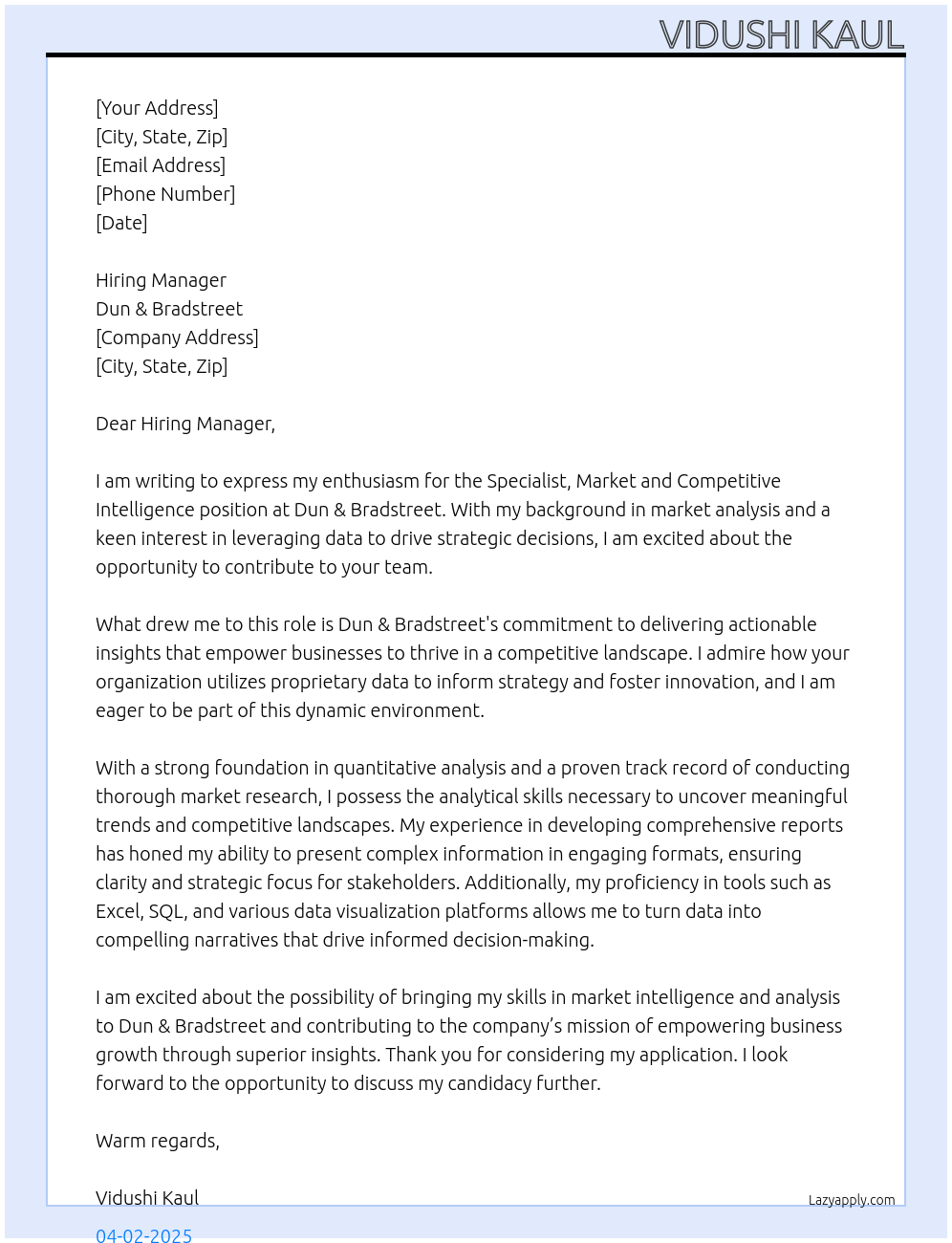 Specialist, Market and Competitive Intelligence Cover Letter At Dun & Bradstreet