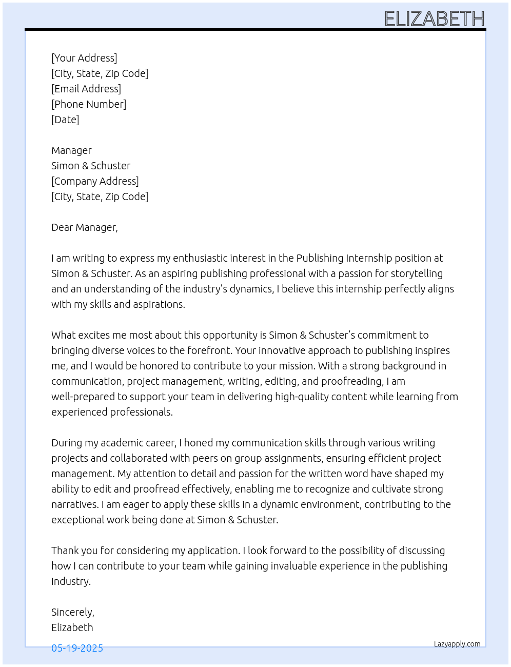 Check out these publishing internship cover letter sample and examples previously used by job seekers to land on job interviews as publishing internship. Use our AI cover letter generator to create a personalized cover letter as publishing internship.