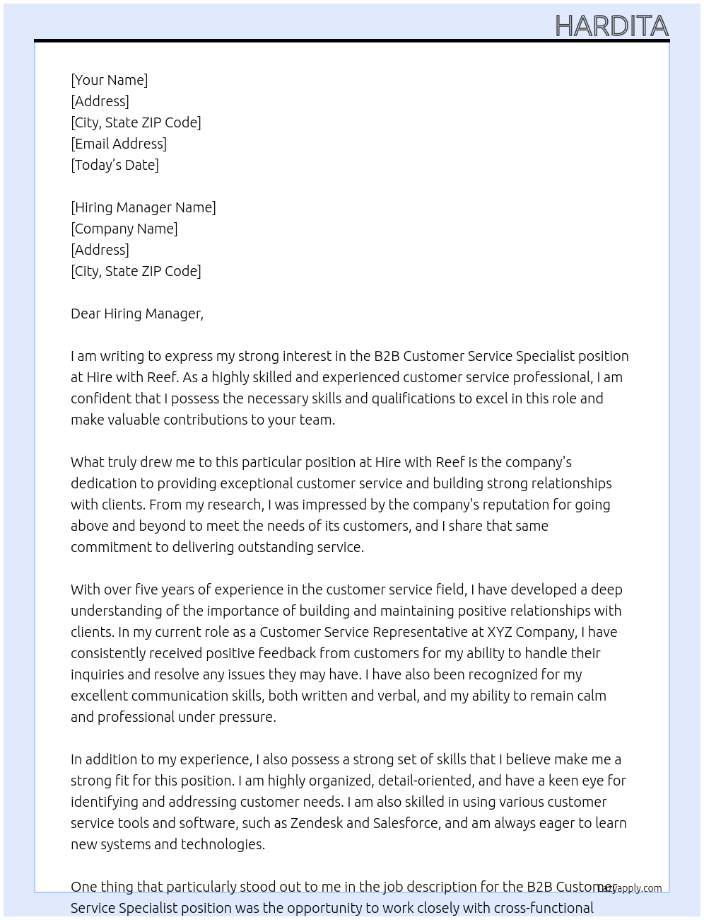 B2B Customer Service Specialist Cover Letter At Hire with Reef