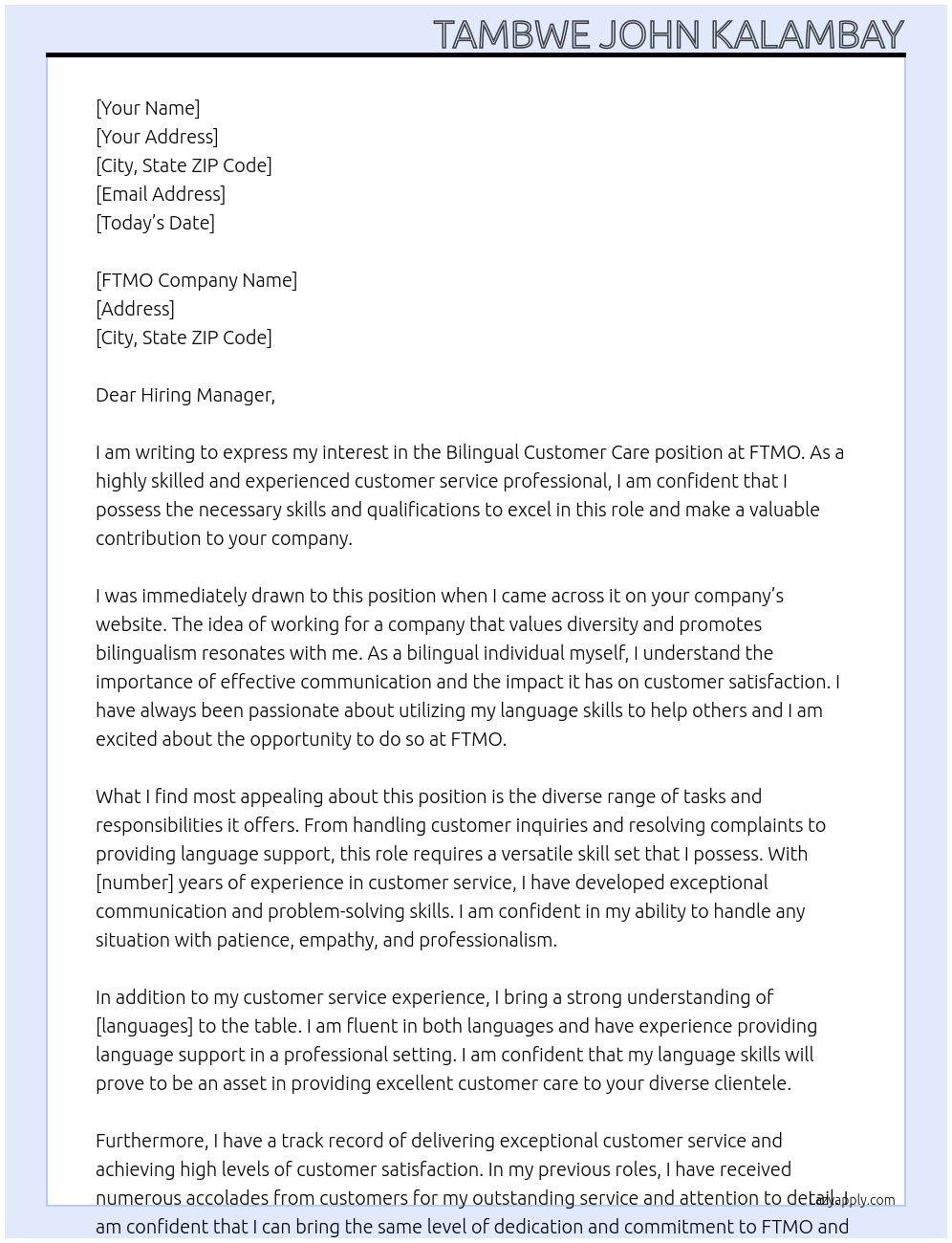 Check out these bilingual customer care cover letter sample and examples previously used by job seekers to land on job interviews as bilingual customer care. Use our AI cover letter generator to create a personalized cover letter as bilingual customer care.