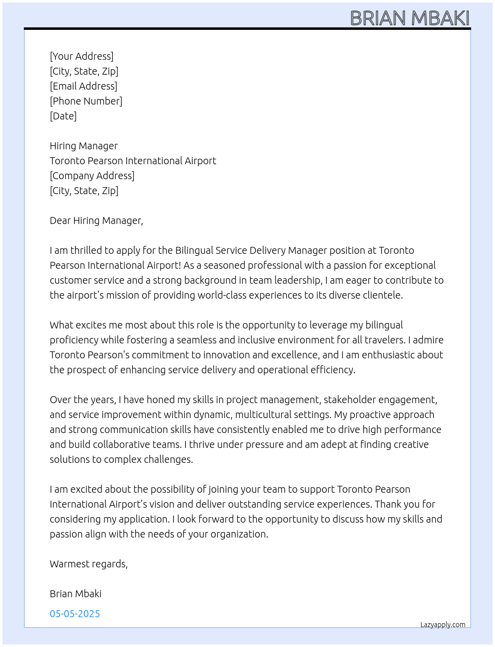 Bilingual Service Delivery Manager Cover Letter At Toronto Pearson International Airport