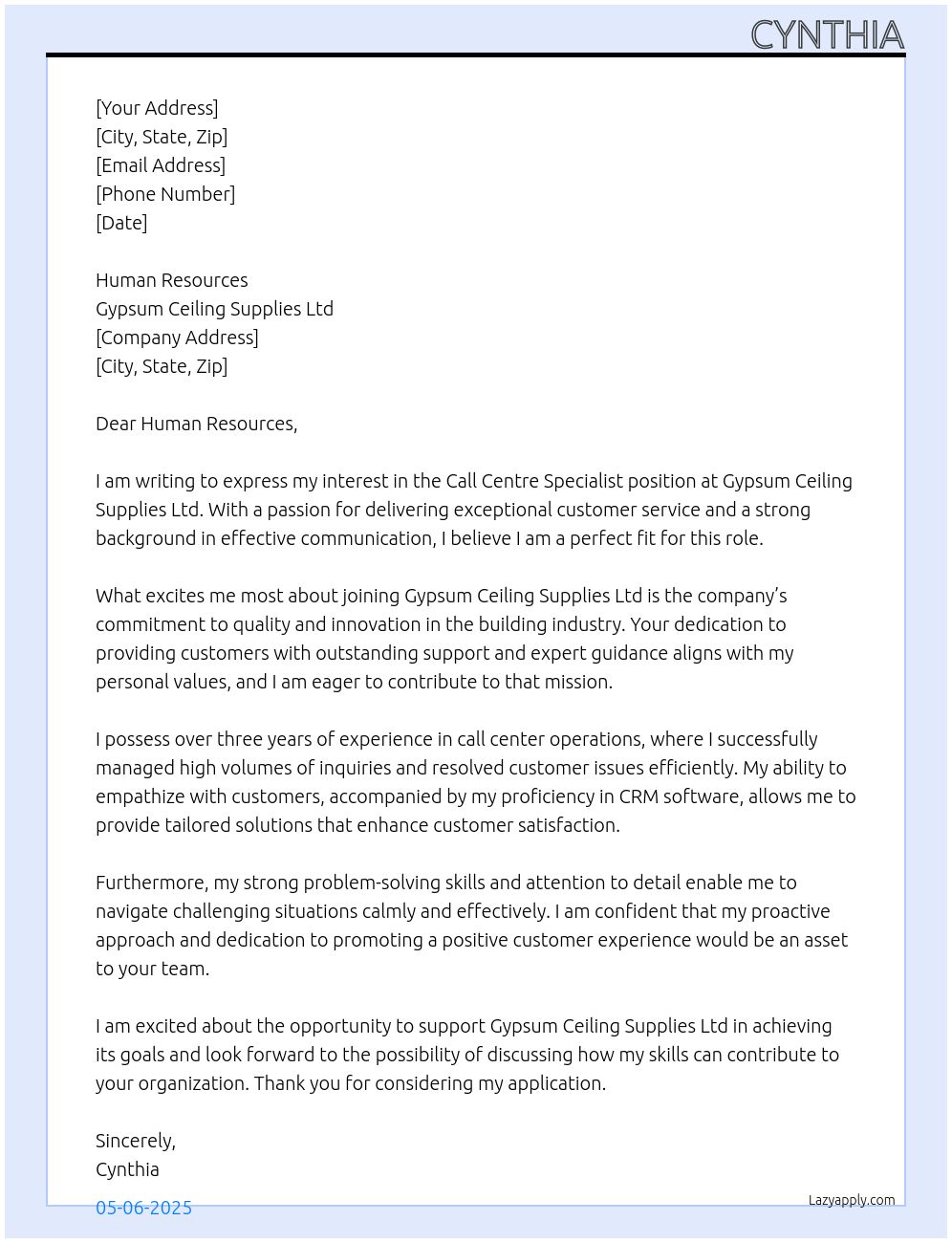 call centre specialist Cover Letter At Gypsum Ceiling Supplies Ltd