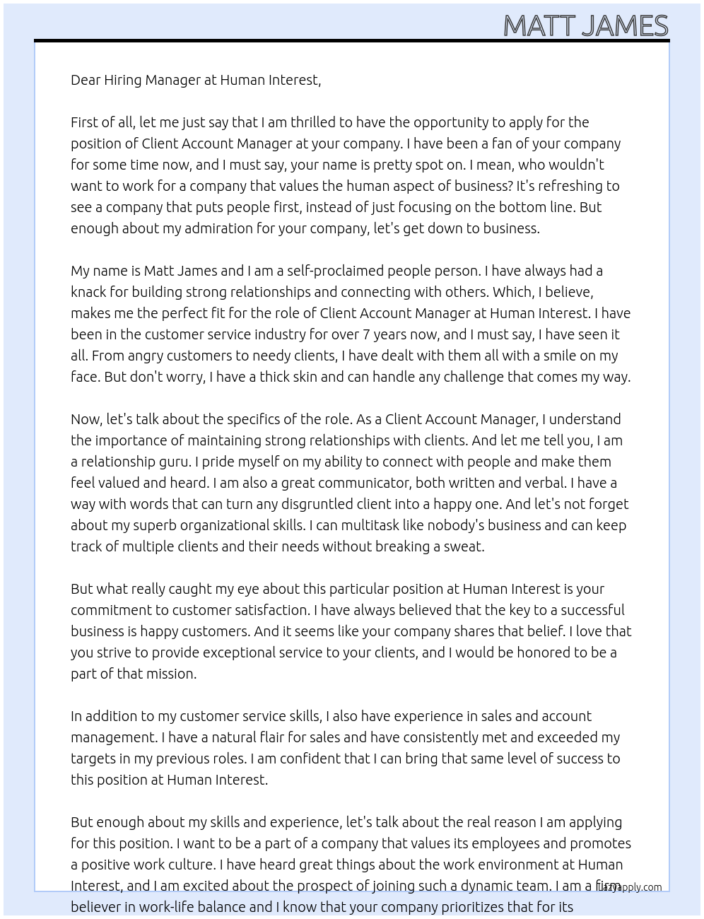 Check out these client account manager cover letter sample and examples previously used by job seekers to land on job interviews as client account manager. Use our AI cover letter generator to create a personalized cover letter as client account manager.