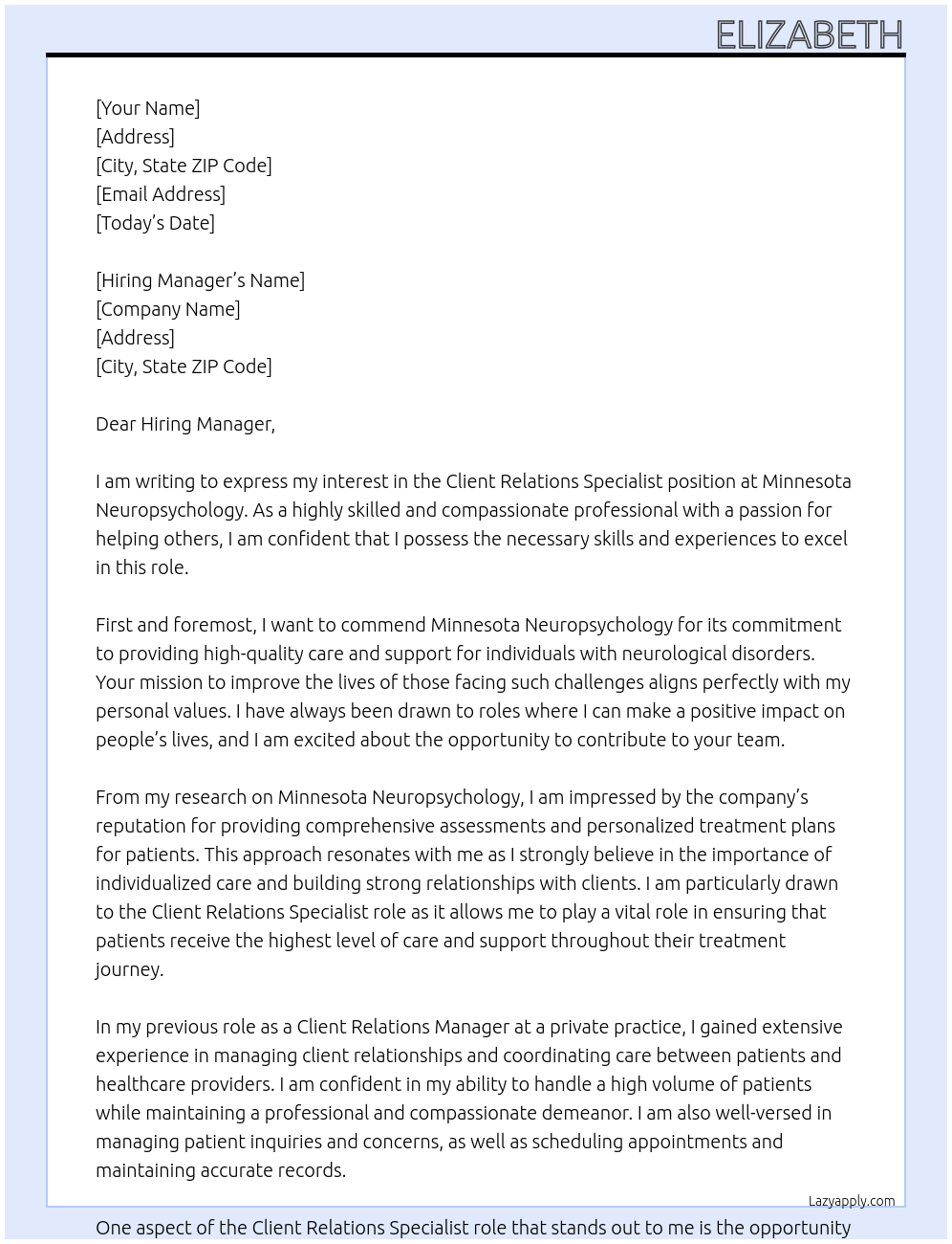 Client Relations Specialist Cover Letter At Minnesota Neuropsychology