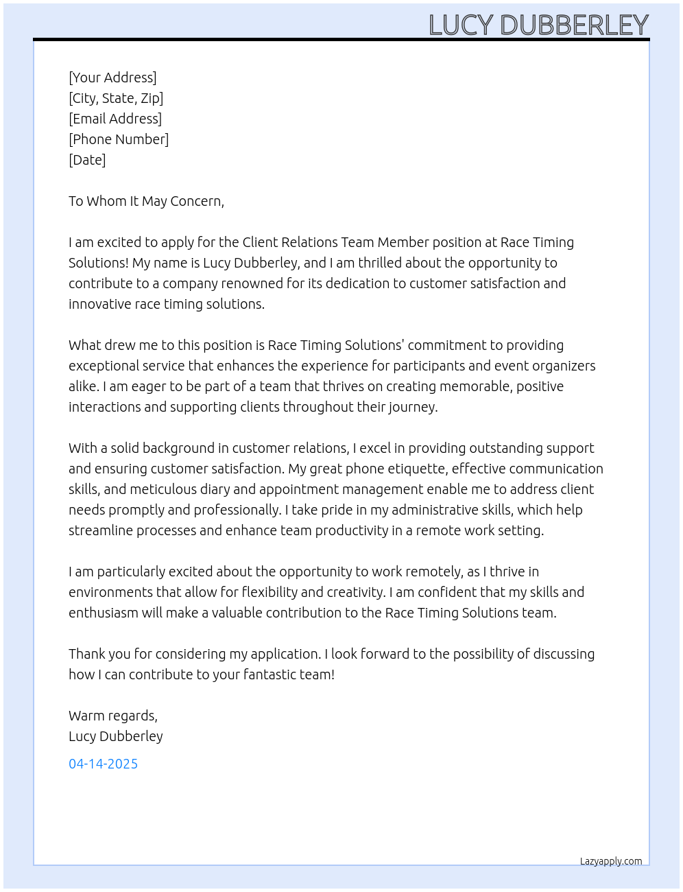 Check out these client relations team member cover letter sample and examples previously used by job seekers to land on job interviews as client relations team member. Use our AI cover letter generator to create a personalized cover letter as client relations team member.