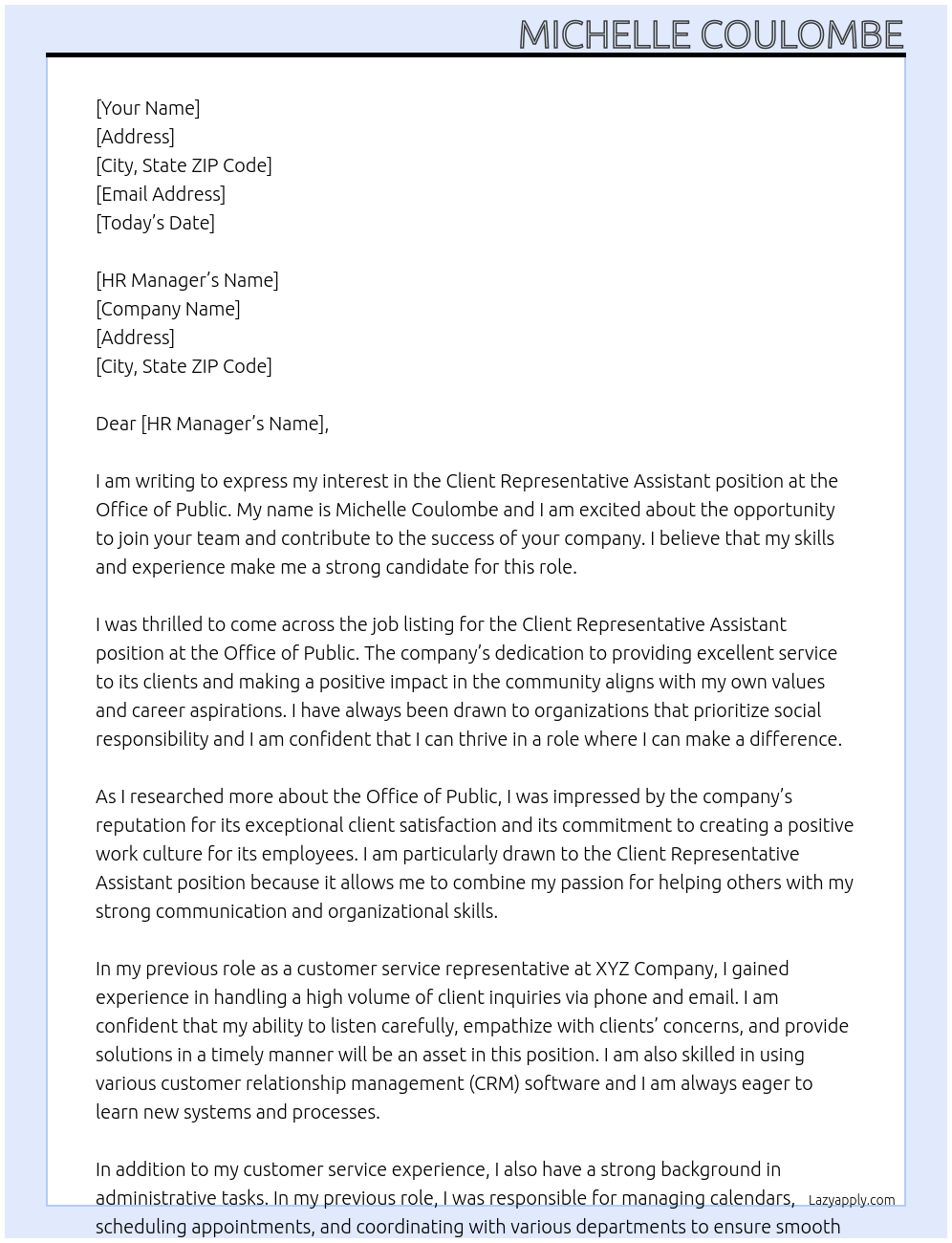 Client Representative Assistant Cover Letter At Office of Public