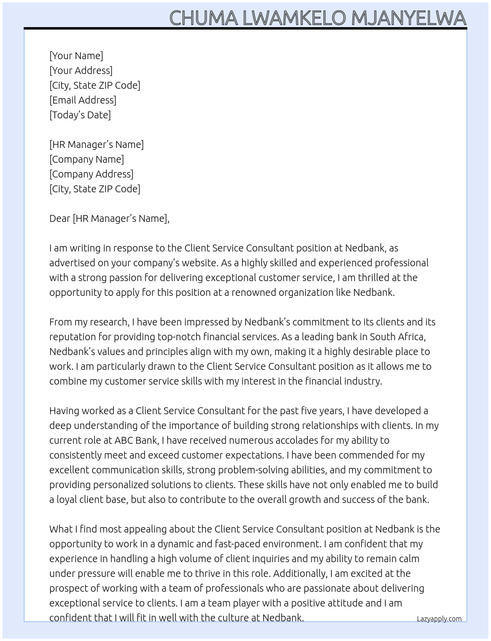 Check out these client service consultant cover letter sample and examples previously used by job seekers to land on job interviews as client service consultant. Use our AI cover letter generator to create a personalized cover letter as client service consultant.