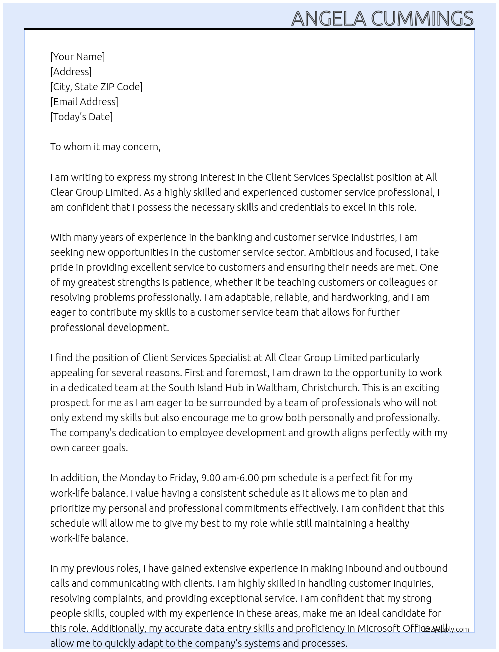 I am writing to express my strong interest in the Client Services Specialist position at All Clear Group Limited. As a highly skilled and experienced customer service professional