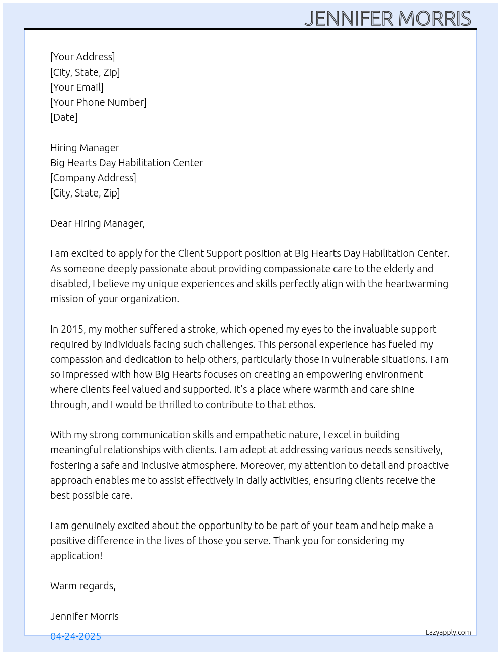 Check out these client support cover letter sample and examples previously used by job seekers to land on job interviews as client support. Use our AI cover letter generator to create a personalized cover letter as client support.