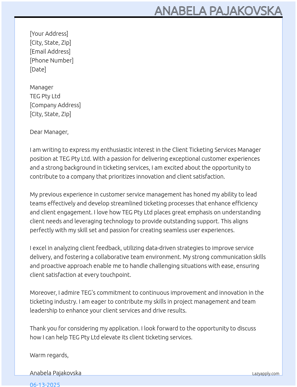 Client Ticketing Services Manager Cover Letter At TEG Pty Ltd