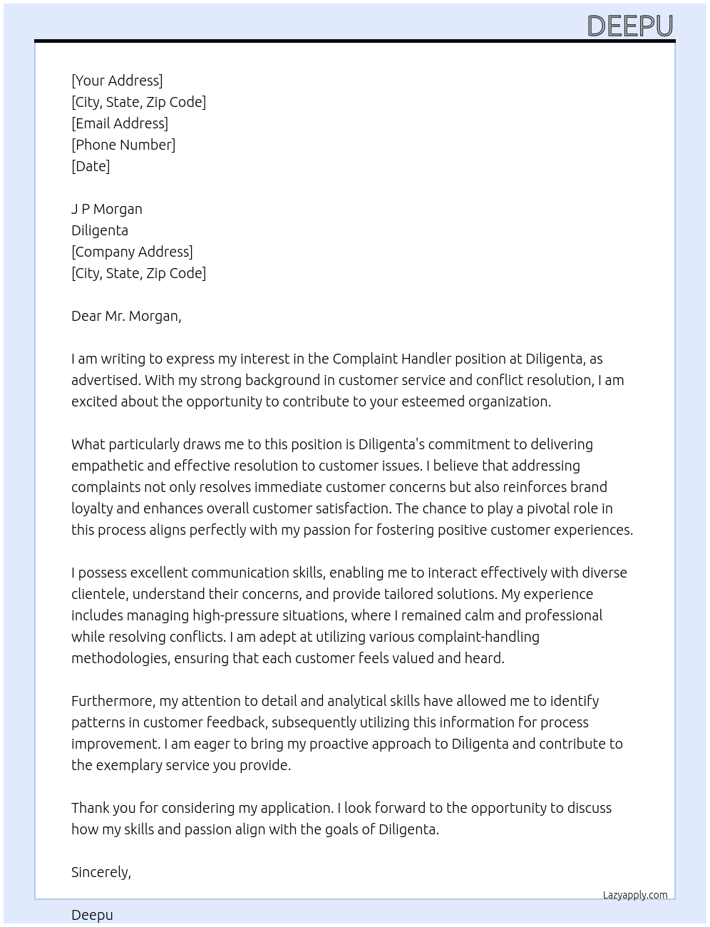 Check out these complaint handler cover letter sample and examples previously used by job seekers to land on job interviews as complaint handler. Use our AI cover letter generator to create a personalized cover letter as complaint handler.