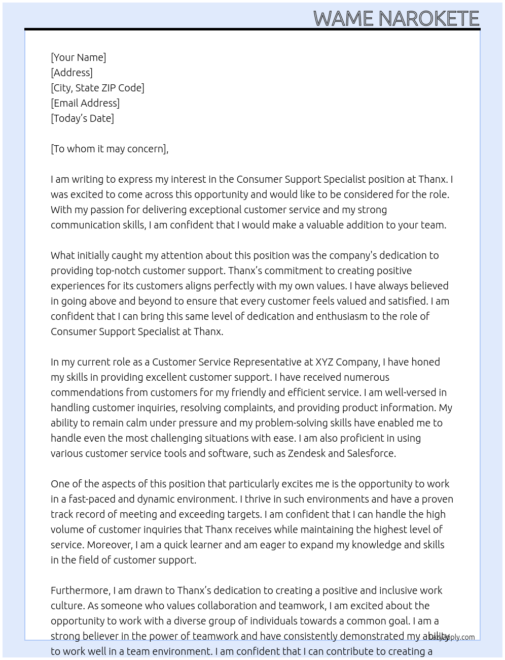 Check out these consumer support specialist cover letter sample and examples previously used by job seekers to land on job interviews as consumer support specialist. Use our AI cover letter generator to create a personalized cover letter as consumer support specialist.