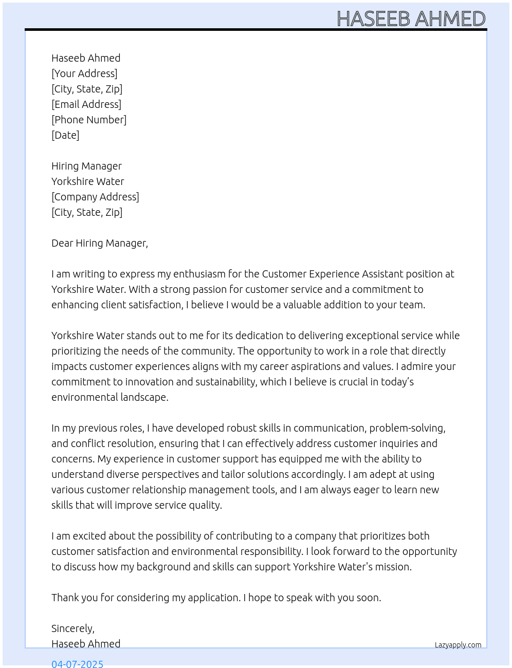 customer experience assistant Cover Letter At Yorkshire Water