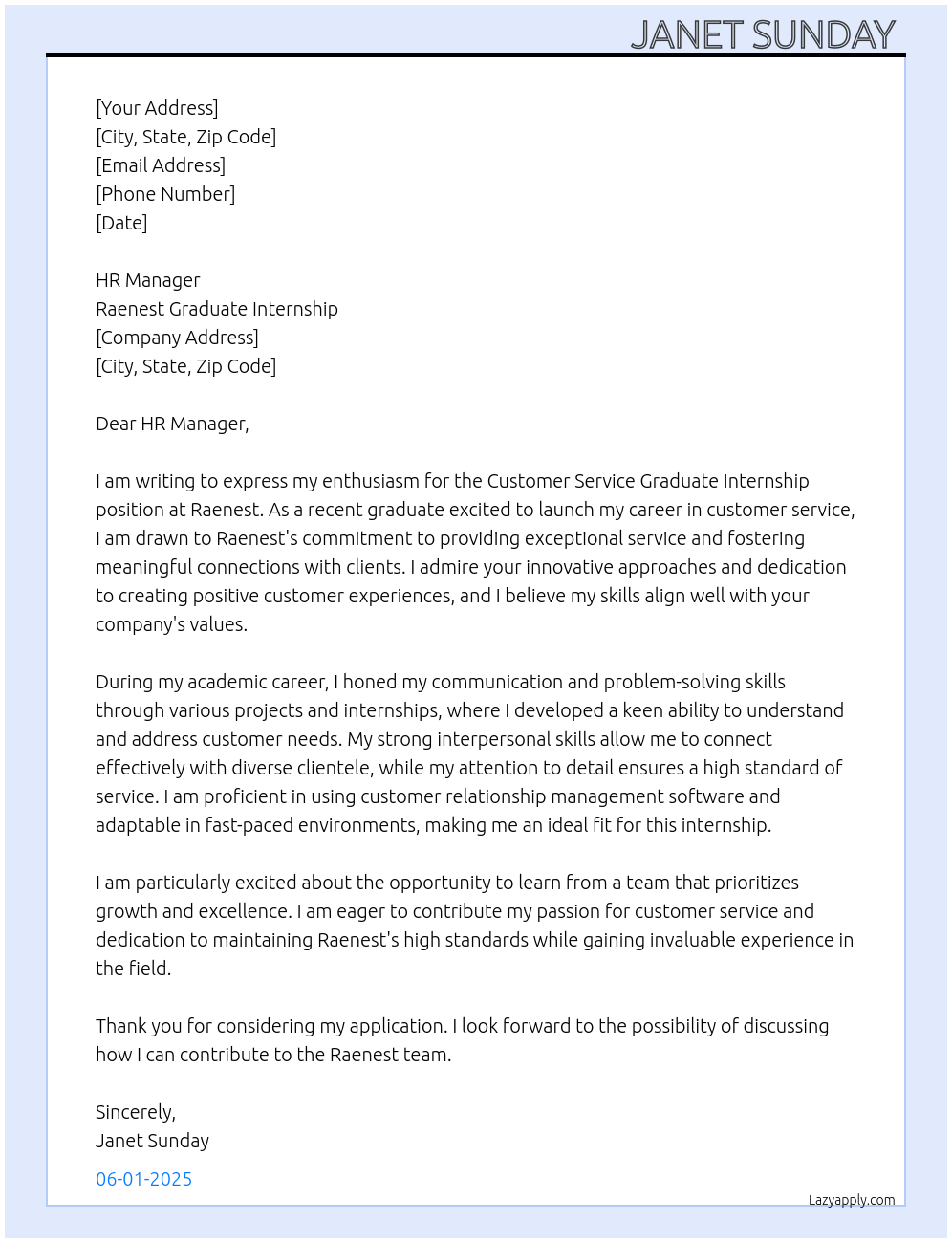Customer Service graduate Internship Cover Letter At Raenest Graduate Internship