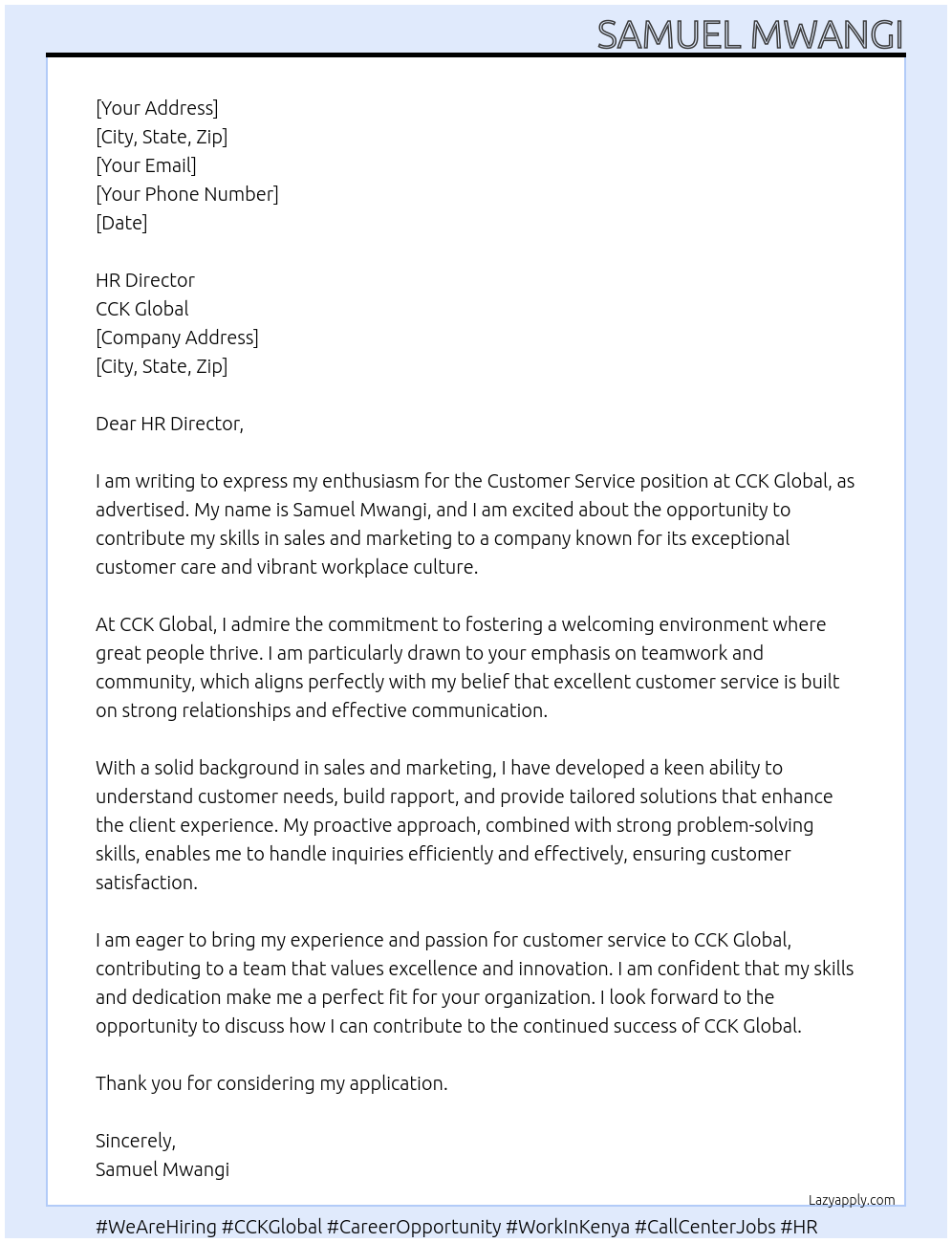 Customer Service position Cover Letter At CCK Global