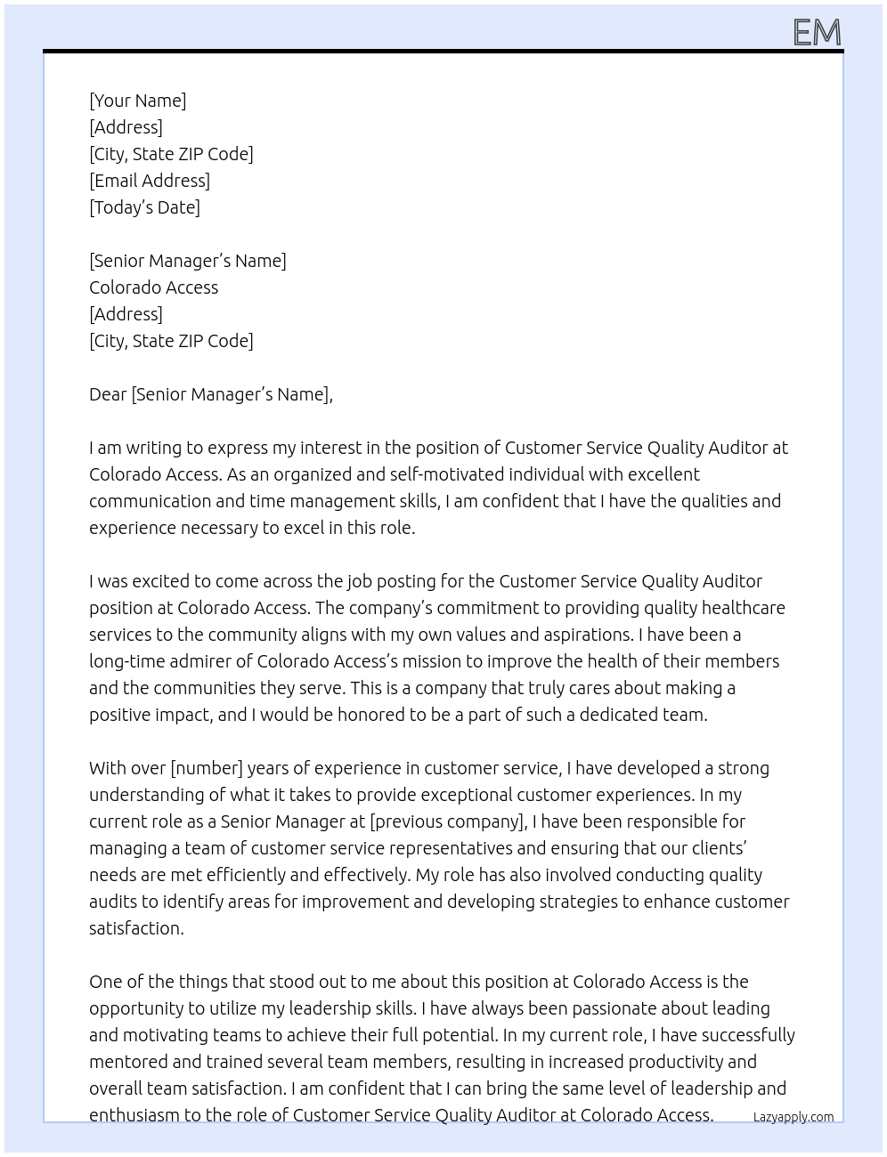 Check out these customer service quality auditor cover letter sample and examples previously used by job seekers to land on job interviews as customer service quality auditor. Use our AI cover letter generator to create a personalized cover letter as customer service quality auditor.