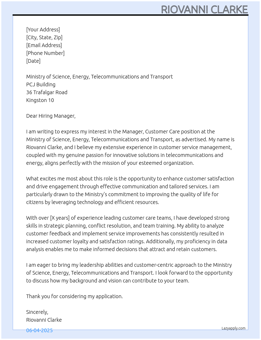 Manager, Customer Care Cover Letter At Ministry of Science, Energy, Telecommunications and Transport.