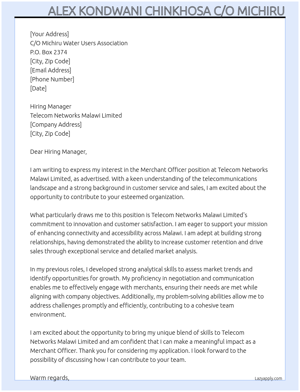 merchant officers Cover Letter At telecom networks malawi limited