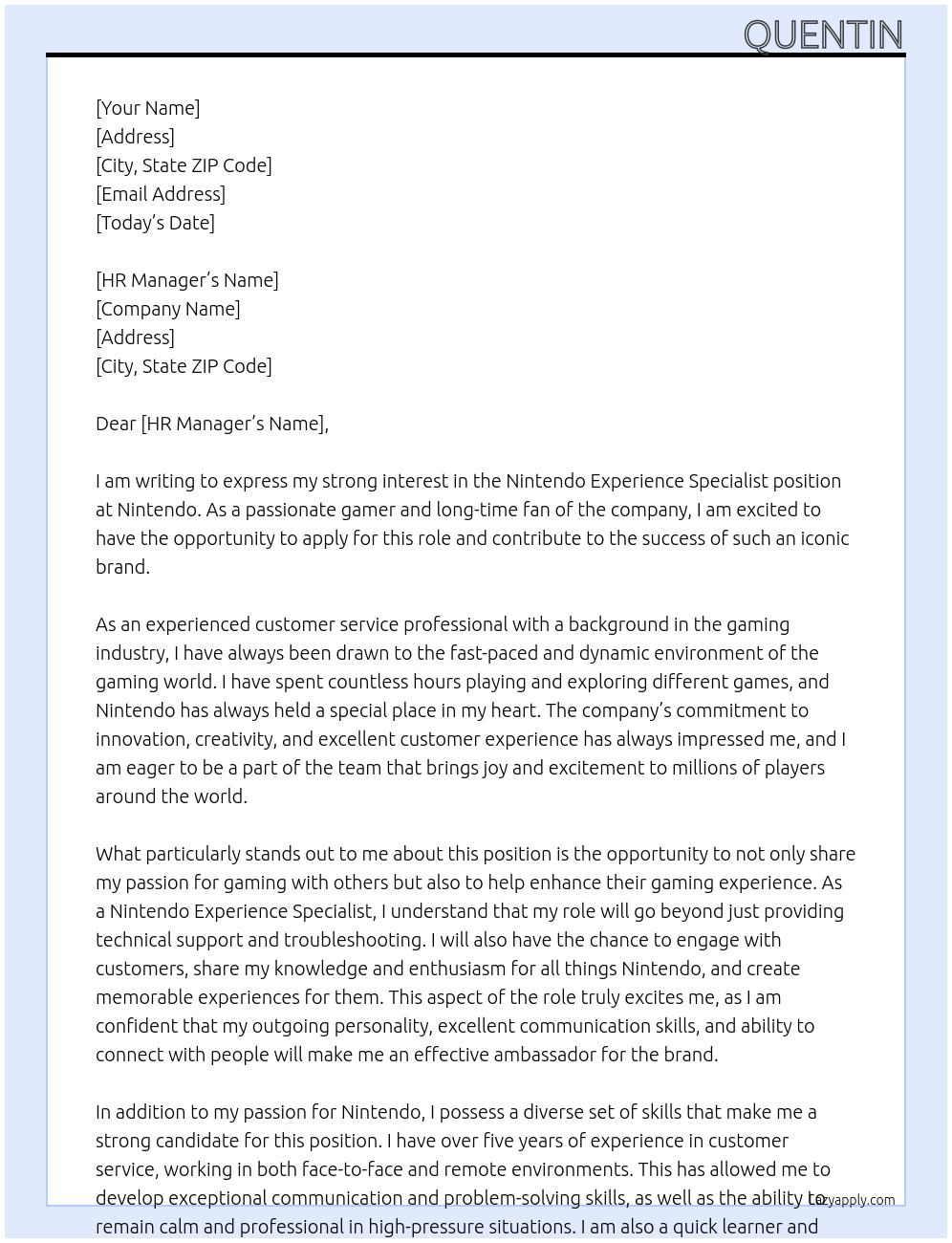 Nintendo Experience Specialist Cover Letter Examples And Template