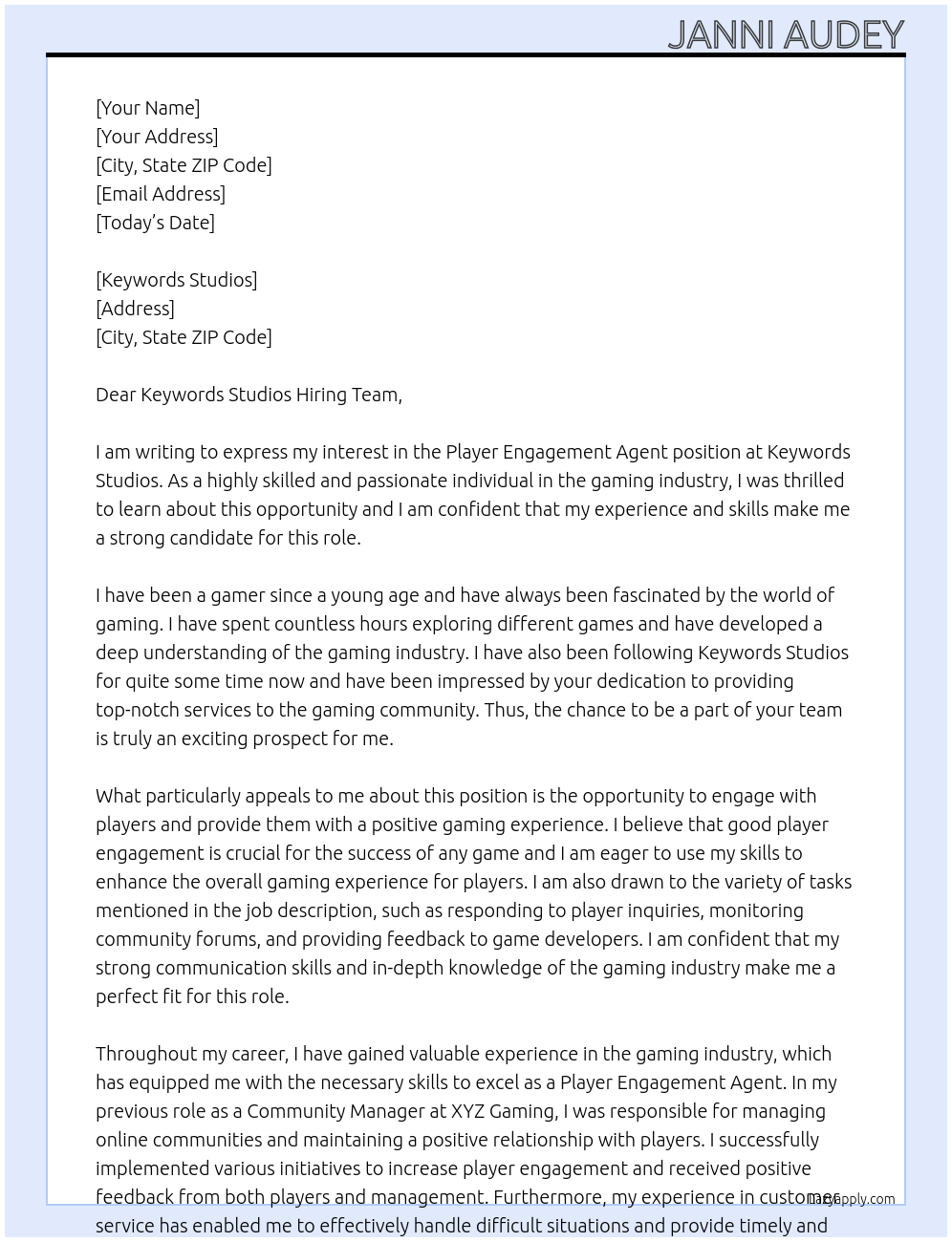 Check out these player engagement agent cover letter sample and examples previously used by job seekers to land on job interviews as player engagement agent. Use our AI cover letter generator to create a personalized cover letter as player engagement agent.