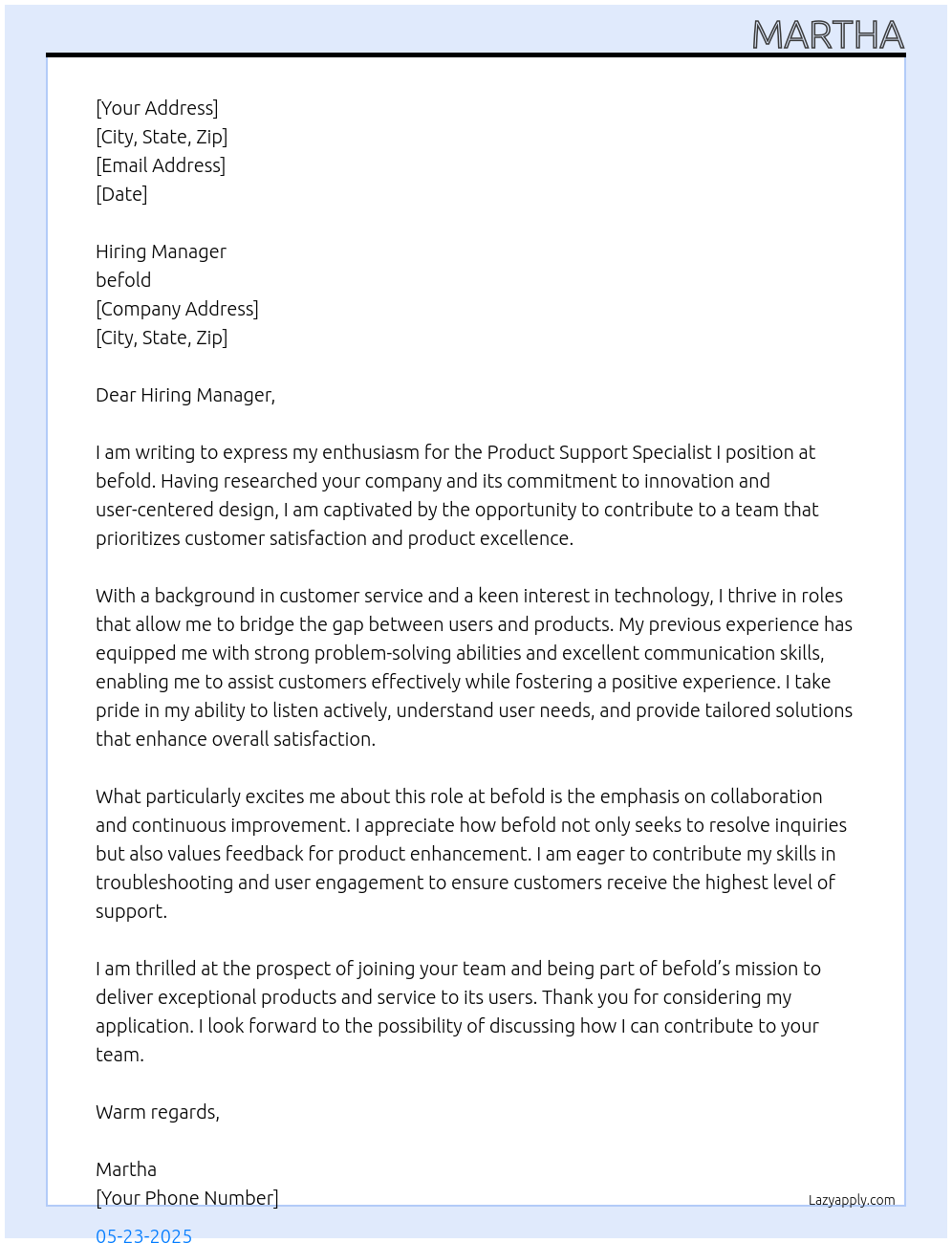 Check out these product support specialist i cover letter sample and examples previously used by job seekers to land on job interviews as product support specialist i. Use our AI cover letter generator to create a personalized cover letter as product support specialist i.