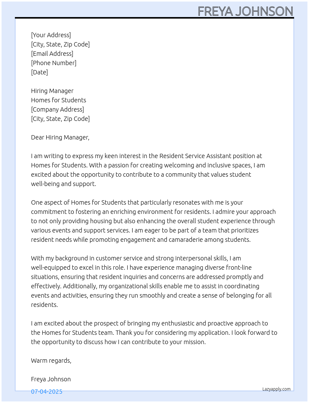 Resident service assistant Cover Letter At Homes for Students