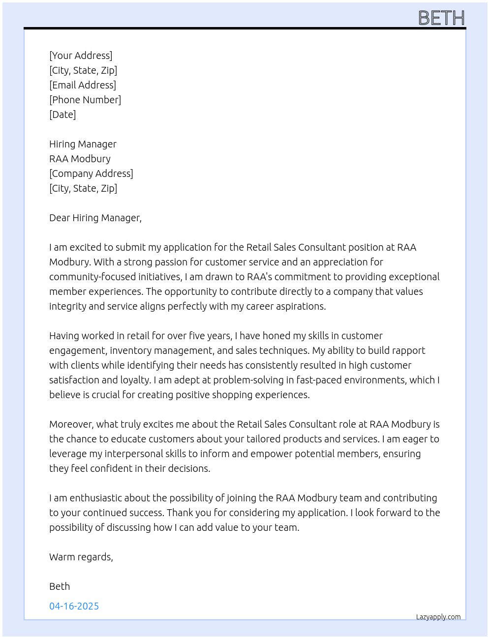 Check out these retail sales consultant cover letter sample and examples previously used by job seekers to land on job interviews as retail sales consultant. Use our AI cover letter generator to create a personalized cover letter as retail sales consultant.