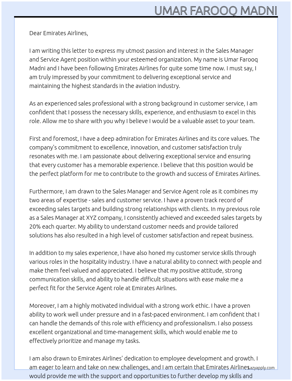sales maneger and service agent Cover Letter At emirates airlines