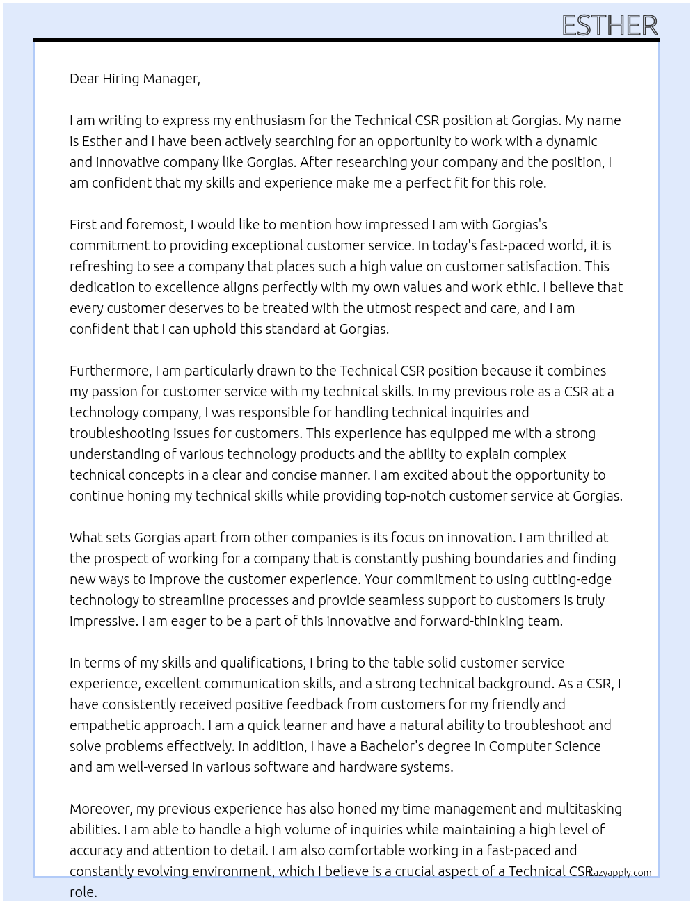 Check out these technical csr cover letter sample and examples previously used by job seekers to land on job interviews as technical csr. Use our AI cover letter generator to create a personalized cover letter as technical csr.