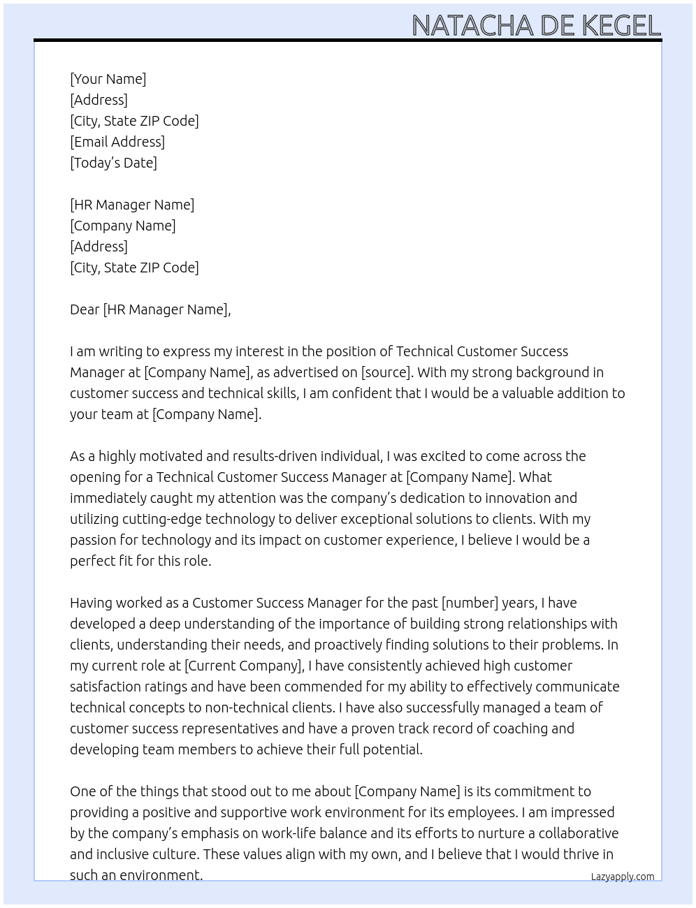 Check out these technical customer success manager cover letter sample and examples previously used by job seekers to land on job interviews as technical customer success manager. Use our AI cover letter generator to create a personalized cover letter as technical customer success manager.