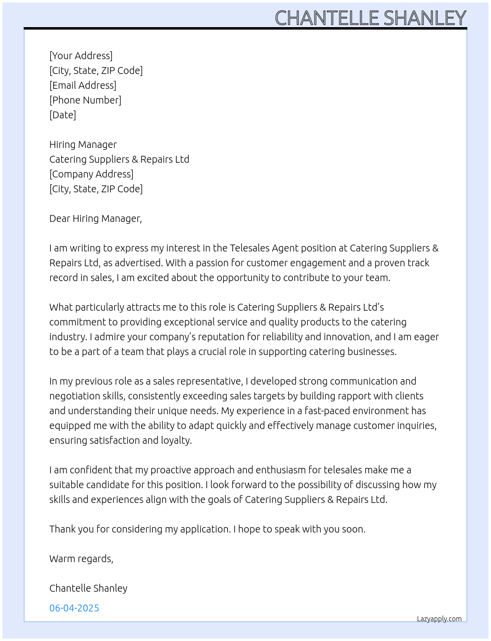 Telesales Agent Cover Letter At Catering Suppliers & Repairs Ltd