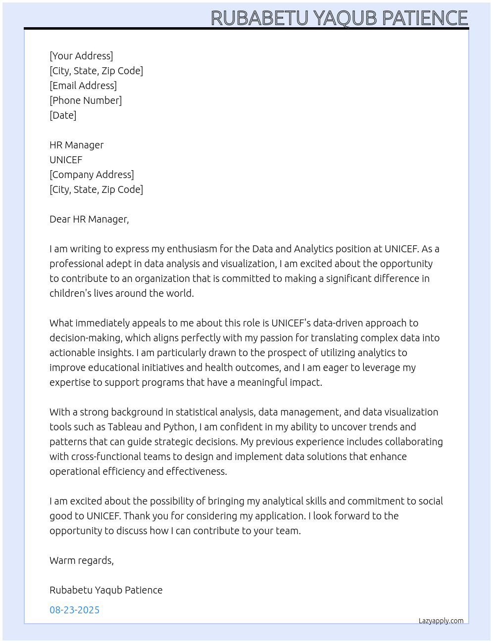 Check out these data and analytics cover letter sample and examples previously used by job seekers to land on job interviews as data and analytics. Use our AI cover letter generator to create a personalized cover letter as data and analytics.
