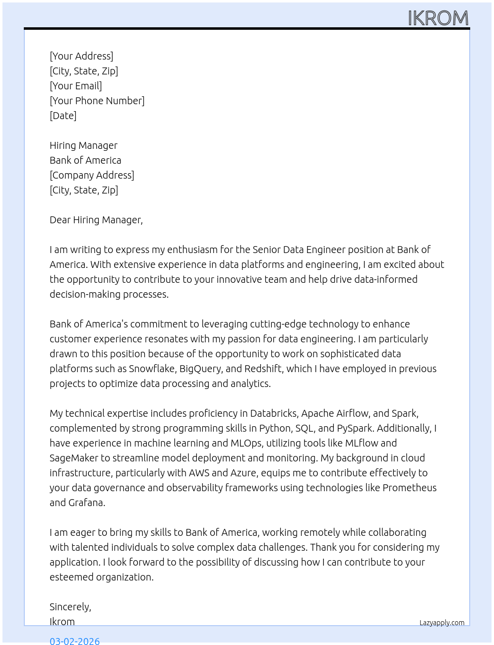 Check out these senior data engineer cover letter sample and examples previously used by job seekers to land on job interviews as senior data engineer. Use our AI cover letter generator to create a personalized cover letter as senior data engineer.