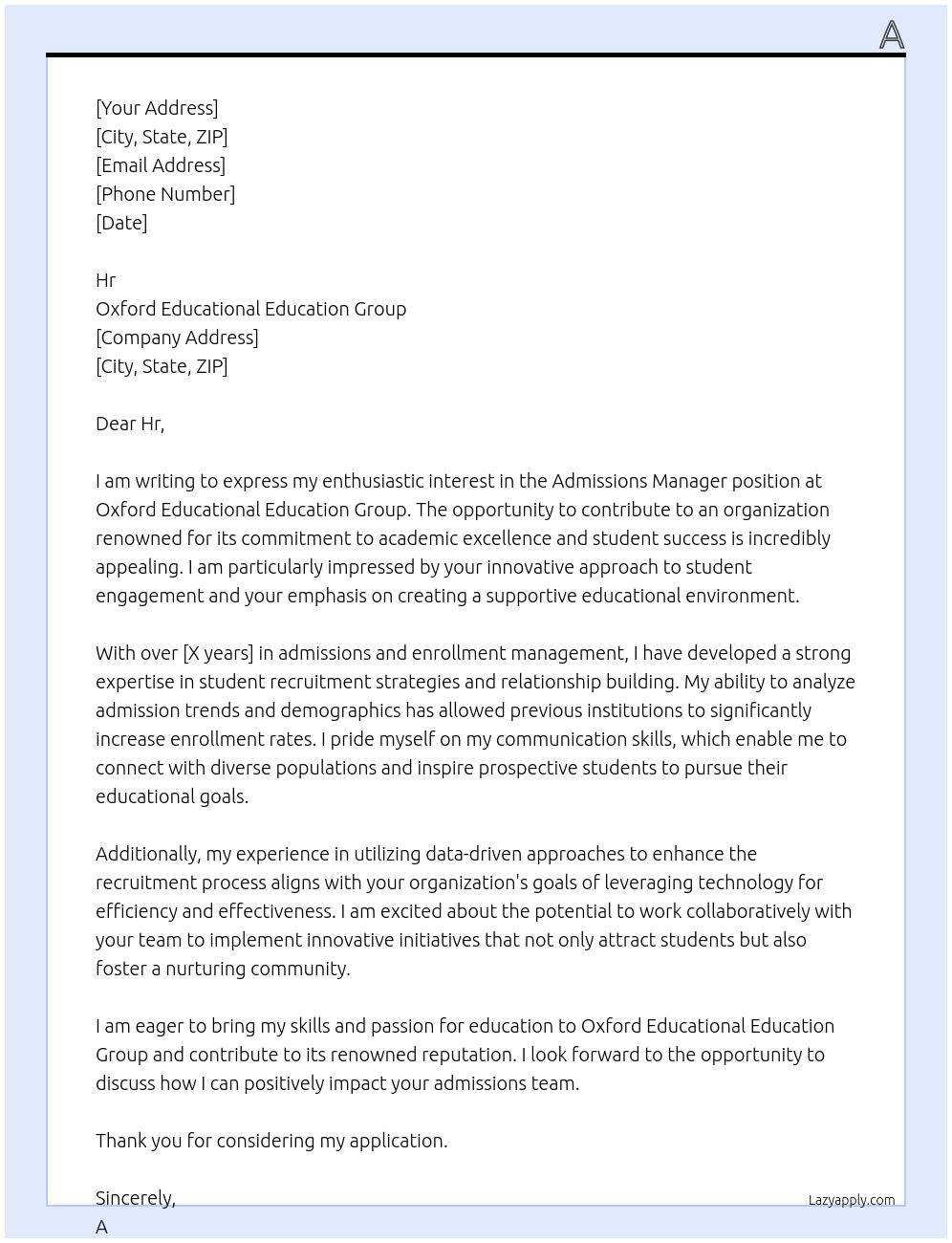 Admissions manager Cover Letter At Oxford Educational Education Group