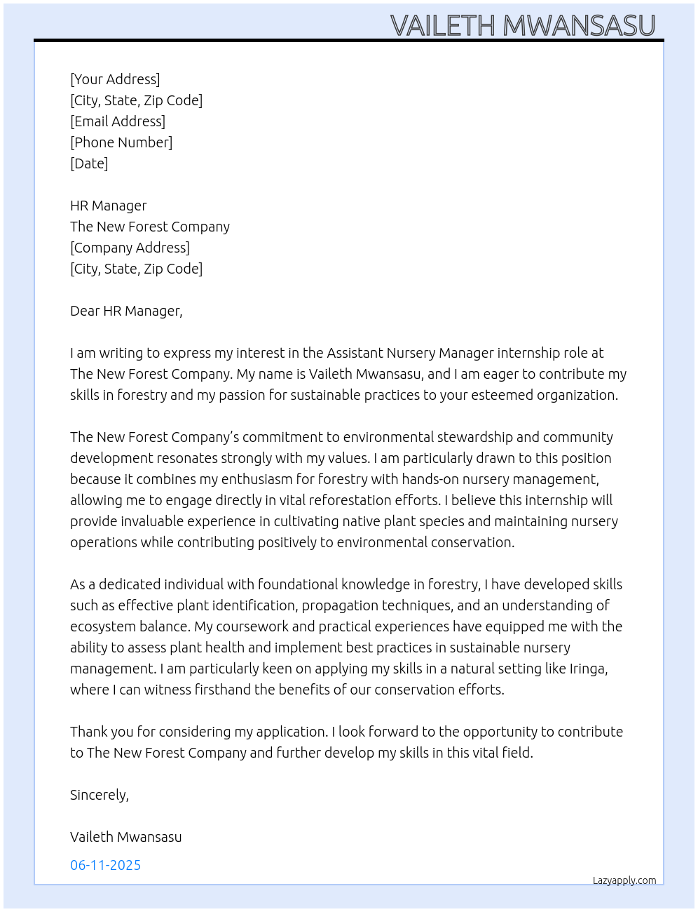 Check out these assistant nursery manager cover letter sample and examples previously used by job seekers to land on job interviews as assistant nursery manager. Use our AI cover letter generator to create a personalized cover letter as assistant nursery manager.