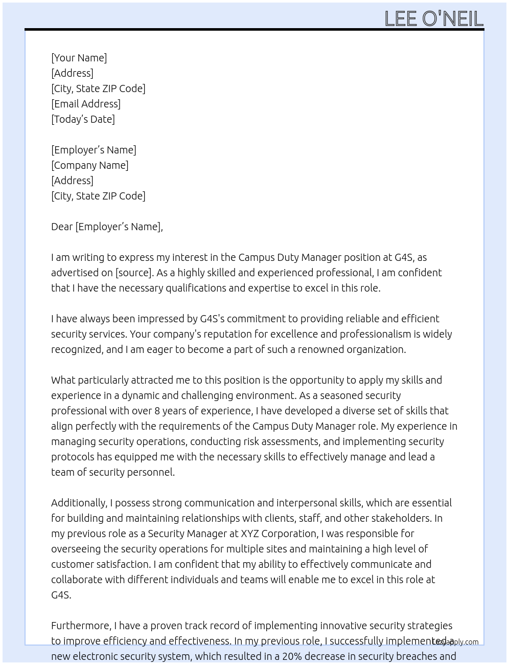 Check out these campus duty manager cover letter sample and examples previously used by job seekers to land on job interviews as campus duty manager. Use our AI cover letter generator to create a personalized cover letter as campus duty manager.