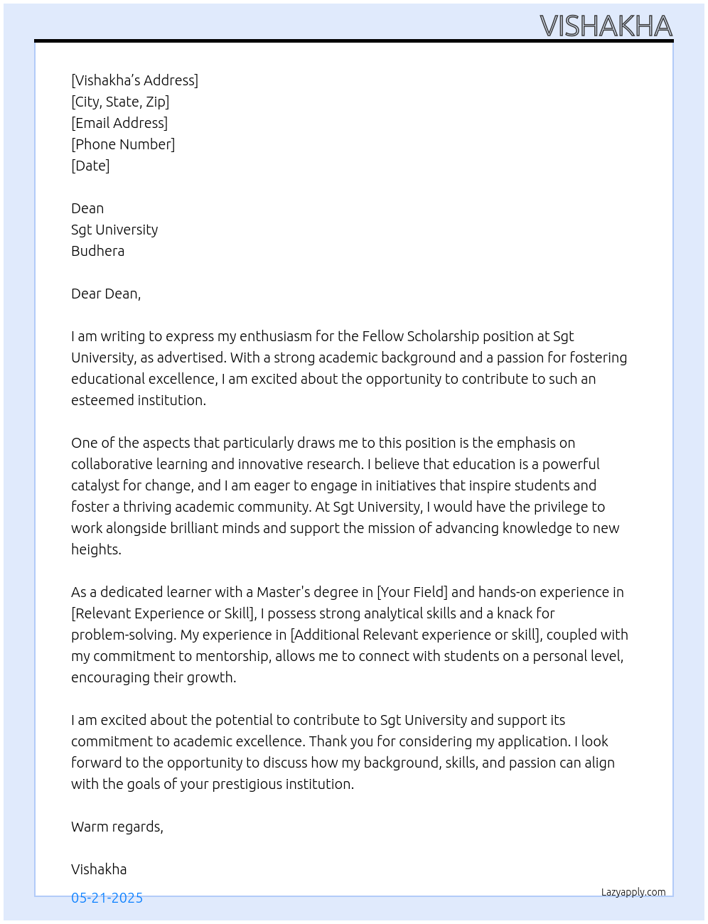 Fellow scholarship Cover Letter At Sgt university, budhera