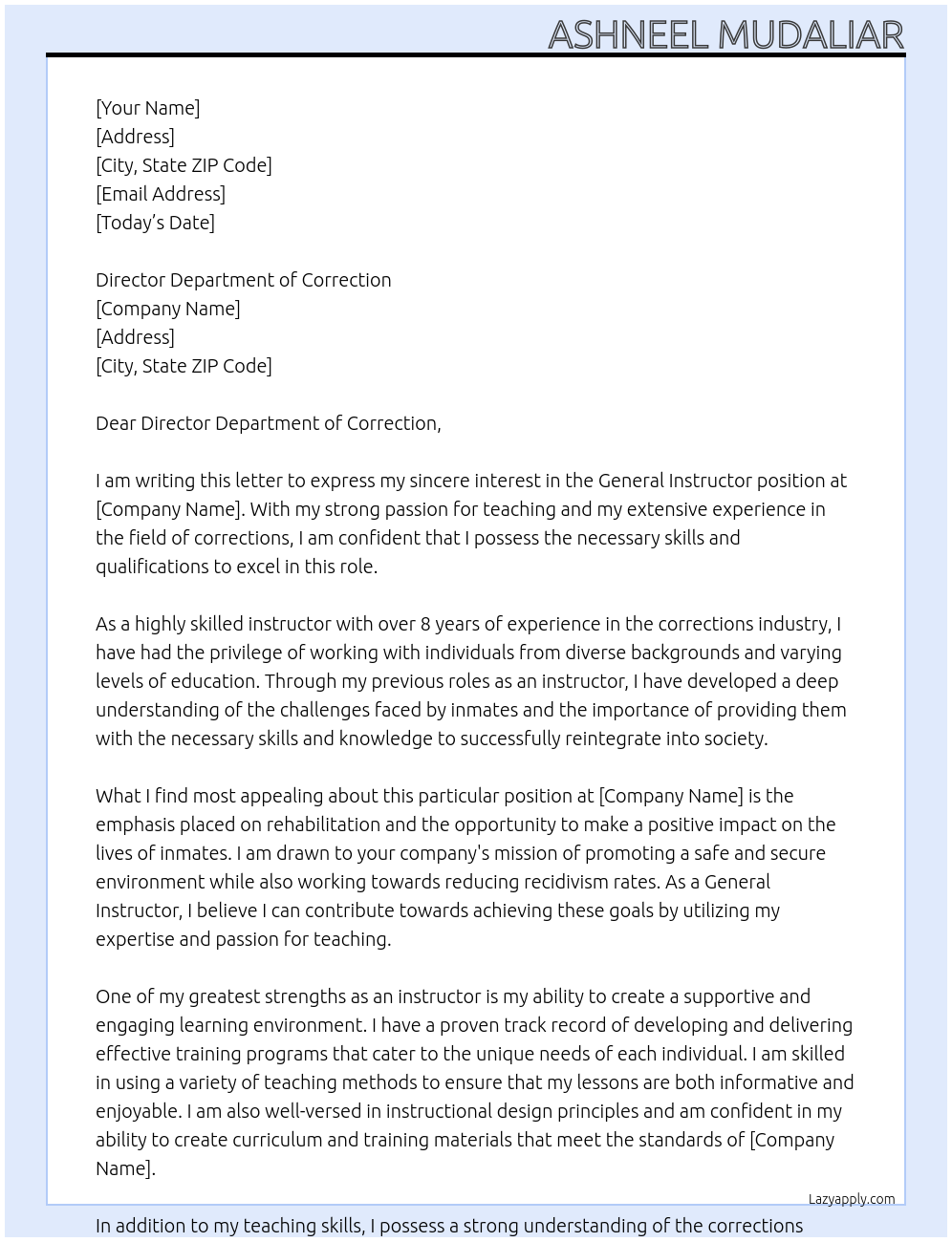 General instructor Cover Letter At Department of Correction